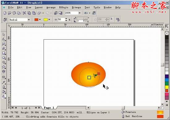 3.这时候的填充,可能你还不太满意,可以选择Fill Tool下面的Interactive Fill Tool来调整。这是Coreldraw独一无二的交互式填充工具,你可以即时看到效果,十分方便。调整在椭圆上显示的色块和箭头,使它如图所示。(3)