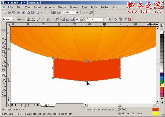 5.用Rectangle Tool画一个小的长方形,作为灯笼的口。边框选择Yellow,内部填充Red。用Interactive Envelope Tool给它加上封套。选择窗口上属性条里的Envelope Unconstrained Mode,调整矩形中间的两个点,使它看上去有些弧度,这样会更真实、自然一些。(6)用同样的手法做出上面的口,翻转一下放在灯笼上。如图(7)
