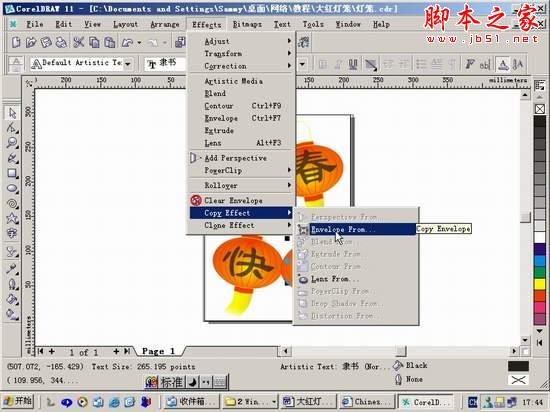 10.选择Text Tool,打出“新”字,将其放到合适的大小,用Interactive Envelope Tool—PReset List—Envelope 1给它加上圆形封套,再用Interactive Transparency Tool,让字看起来象写在灯笼上的。(12)其他几个字的封套和透明效果可以用Effects—Copy Effect直接从“新”字的属性复制过来。(13)
