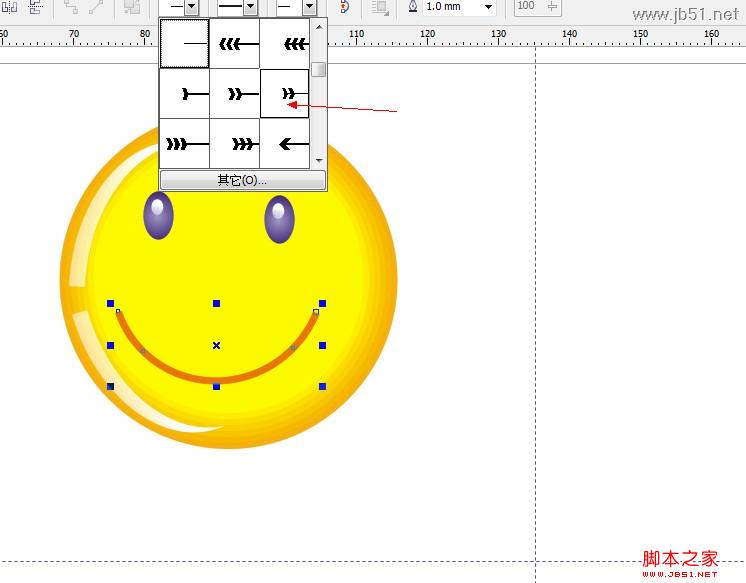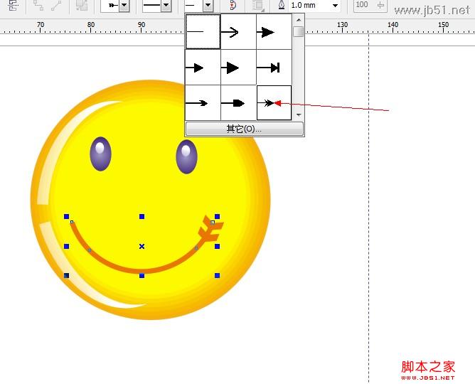 set7:在颜色中设置轮廓线颜色的CMYK值为:3、66、96、0,选择合适宽度按,单击确定。按Ctrl+Q,将弧形转换为曲线,选择挑选工具,在属性栏中起始跟结束箭头选择器中选择如下图形。