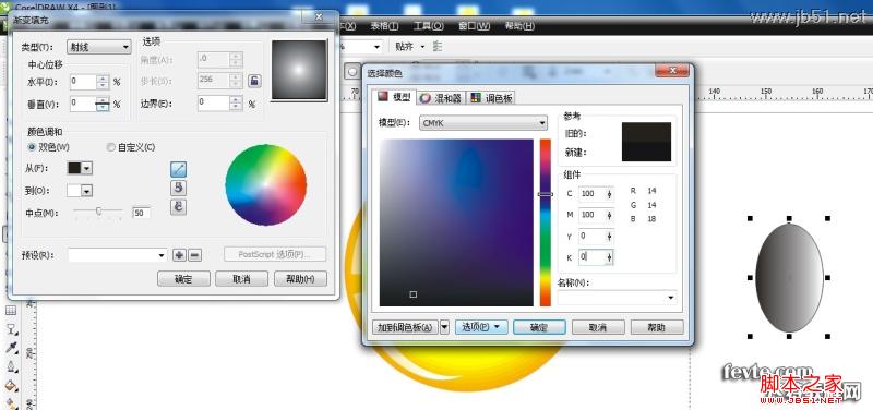 绘制一个椭圆,选择渐变填充,在类型中选择射线,点击双色单选框,从选项CMYK:100、100、0、0,到选项CMYK:31、28、4、0,中间点选项数值设置为50,单击确定,去除轮廓线。