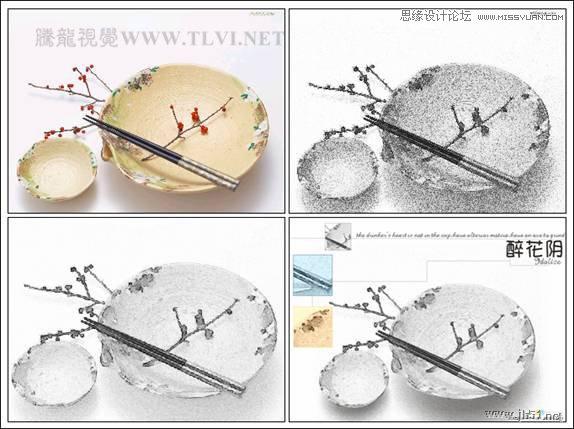该实例的制作是在Corel PHOTO-PAINT中,将素材图片去色、添加特殊纹理效果,并以不同的合并模式混合图片,制作出基本的素描效果。然后将经过处理的素材图片导入CorelDRAW中继续编辑,为图片设置透明效果,添加阴影图像等,进一步丰富和完善画面效果。如图9-3所示,为本实例的制作流程。