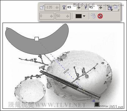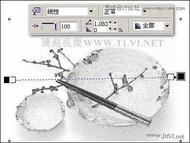 (2)选择工具箱中的“交互式透明”工具,为图像添加透明效果,并拖动调色板中的白色块到虚线适当位置,如图9-16所示。