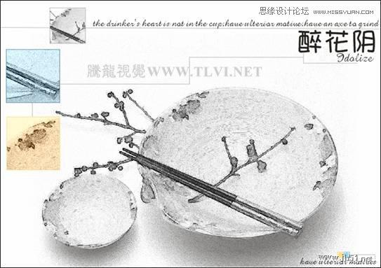 该实例制作的是一幅具有现代素描绘画特效的装饰画。素描是一切绘画的基础,它是用线条描写对象轮廓,通过线条的丰富变化来表现主体物的明暗关系、质感等。使用素描手法绘制的静物装饰画,画面写实,用笔清秀淡雅,给人一种简洁朴素的印象。在该实例的制作中,针对素描画的笔触特点和绘画风格,对素材图片进行调整,并添加各种特殊的纹理效果,使画面呈现出生动逼真的素描特色。如图9-2所示为本实例的完成效果。