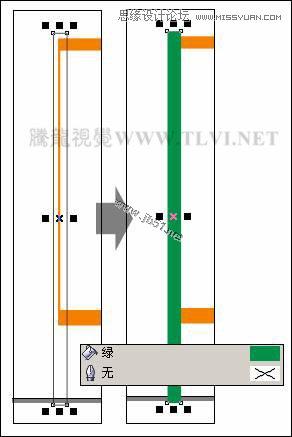 (3)使用“挑选”工具,按下小键盘上的键,将橘红矩形原位置再制,并参照图6-93所示调整其大小位置和填充颜色。