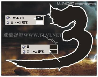 (7)为处理后的图形添加宽度为4mm的黑色描边效果,然后执行“排列”→“将轮廓转换为对象”命令,按下键,将分离出来的轮廓图形向下移动一层,然后为该轮廓图形添加宽度4mm的白色轮廓,接着再将白色图形填充为黑色,轮廓色设置为黑色,宽度为4mm,效果如图6-121所示。