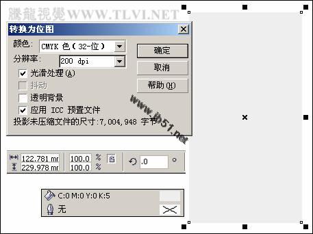 (9)使用"矩形"工具,在页面空白处绘制一个矩形,设置填充色为灰色,轮廓色为无。然后执行"位图"→"转换为位图"命令,打开"转换为位图"对话框,参照图5-11所示设置对话框,将矩形转换为位图。