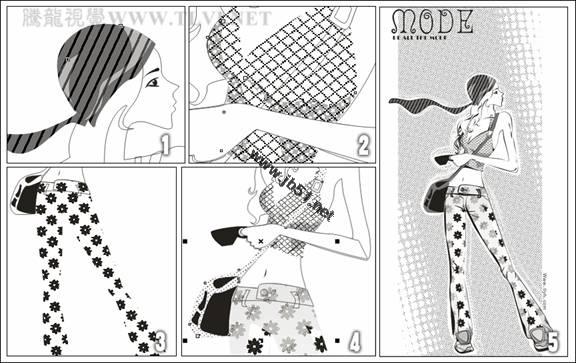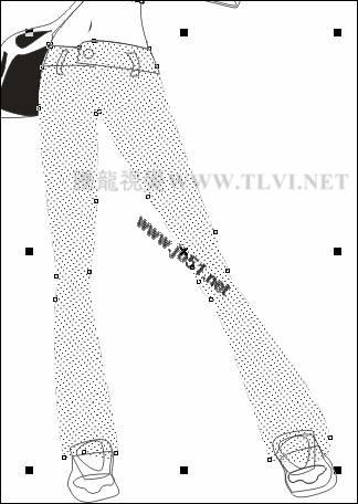 (11)将网点图像再制,执行"效果"→"图框精确剪裁"→"放置在容器中"命令,当鼠标出现黑色箭头时,单击裤子轮廓图形,将网点图像放置到裤子轮廓图形当中,如图5-13所示。