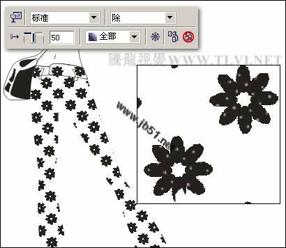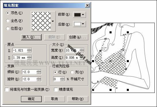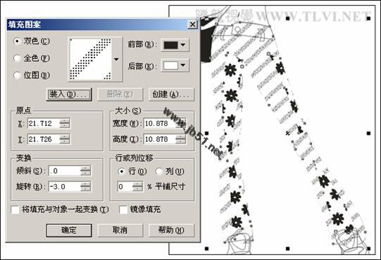(8)选择裤子图形,将其再制并放置到页面空白处,以便下面再对其进行编辑。然后参照图5-10所示设置"填充图案"对话框,为原裤子图形填充图案,并设置裤子图形的轮廓色为无。