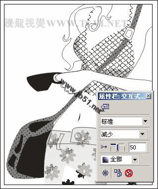 (16)选择女孩背包图形,将其填充为50﹪黑,轮廓色为无,接着参照以上图框精确剪裁方法,将页面空白处网点图像放置到女孩背包图形当中,如图5-18所示。
