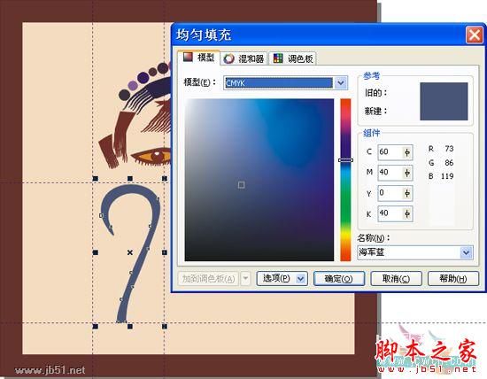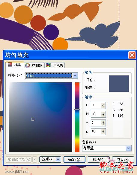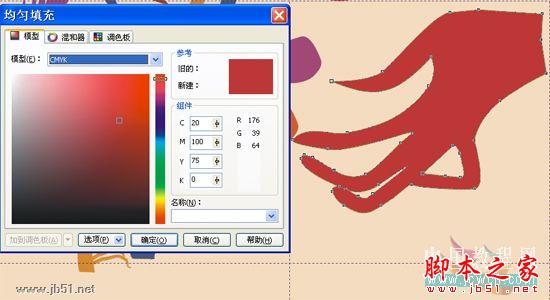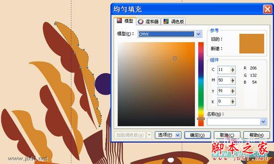 2、双击“矩形工具”创建一个与文档同样大小的矩形,并将其填充(按Shift+F11组合键,弹出“均匀填充”对话框)为朱褐色(C:60,M:93,Y:93,K:19),轮廓线也填充为朱褐色。如图2所示:
