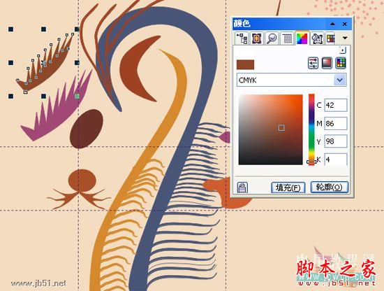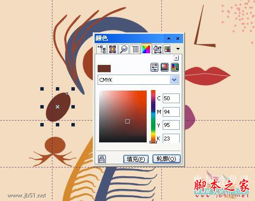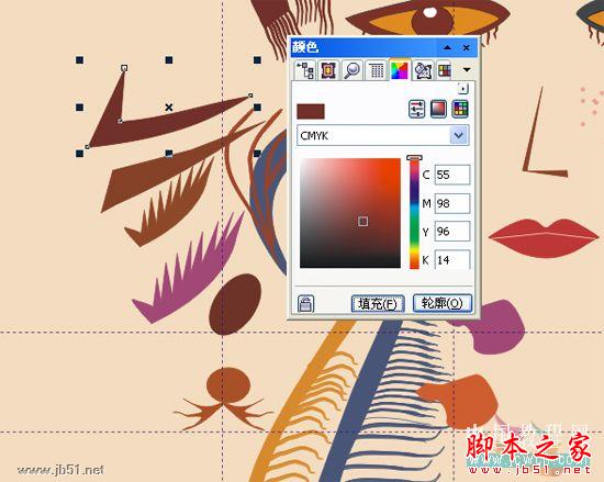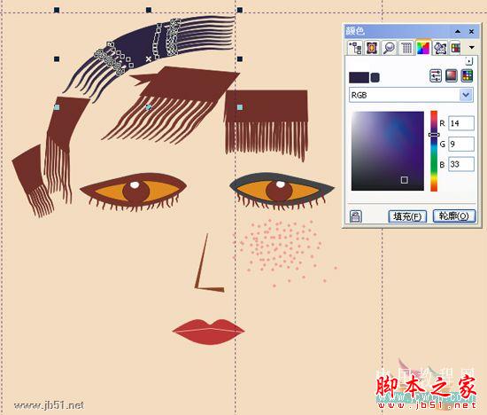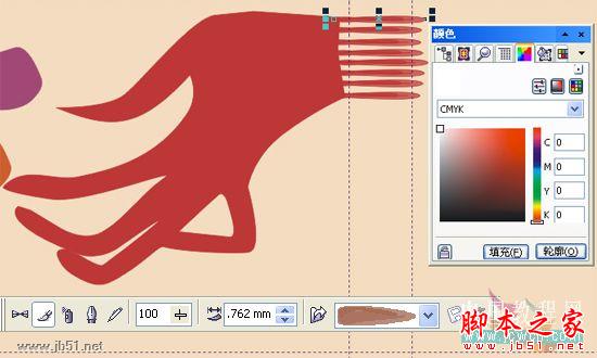 15、单击“钢笔工具”及“艺术笔工具”创建该图形,选择调色板中的相应颜色,填充图形如图15A所示: