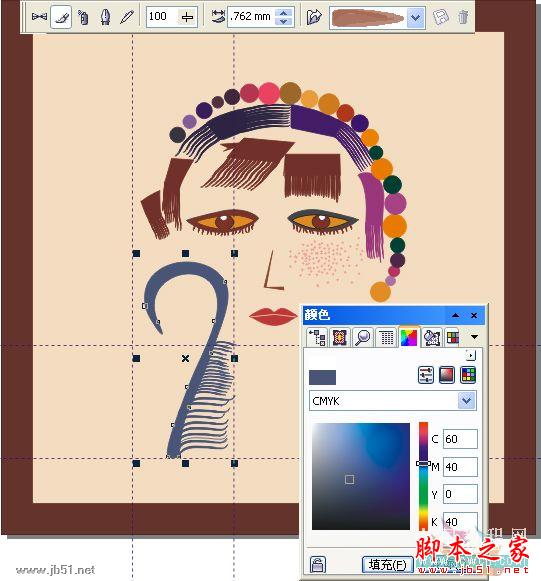 19、单击“椭圆工具”绘制多个小圆形(24个)做为美女的头饰,单击“填充工具”分别为其填充颜色(颜色方案请自行进行协调搭配),效果如图19A所示: