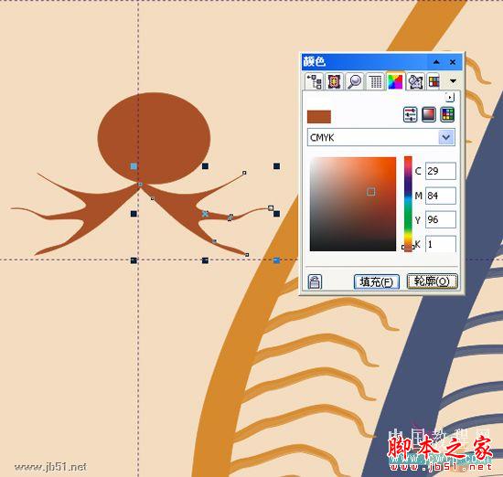 单击“钢笔工具”,创建图形,结合“形状工具”,在所需调节的点上右击选择“曲线”(或称为“反转曲线”)命令,进行圆滑调节。然后,选择调色板中的相应颜色,填充图形。如图31B所示: