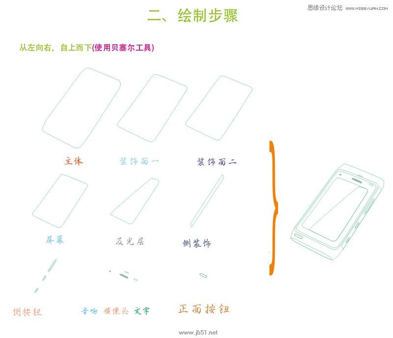 这些很简单吧,就是用贝塞尔曲线做的,在PS里就是钢笔工具!这里要做说明的是:在画正面按钮和文字时,要注意透视,在效果工具栏里有添加透视的命令!还有侧面的按钮时椭圆套的。