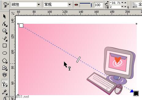 将距形填充为粉红色,同时选择“交互式透明工具”,并设置透明类型为“线型”,如图14所示,让靠近电脑的部分通过透明而呈现出来。