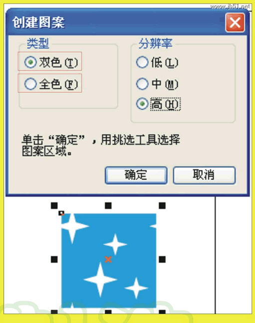 7、随意画两个图形,在填充工具里有个图样填充对话框,打开后在双色或全色中就可找到你刚才定义的图样了,试一试吧!