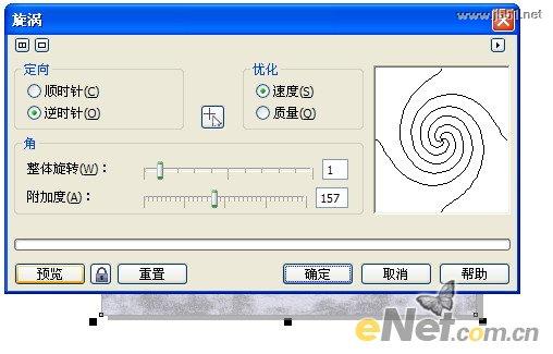 5.执行“位图”---“扭曲”---“漩涡”命令,在打开的对话框中选中“逆时针”命令,其他参数如图6所示进行设置,得到的图像效果图7所示: