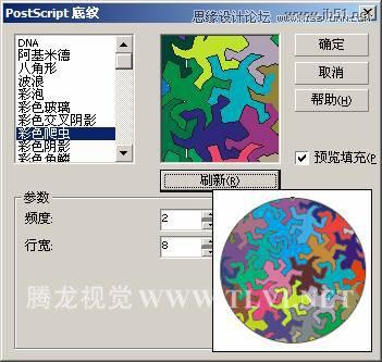 (2)保持圆形的选择状态,在“交互式PostScript填充”的属性栏中单击“编辑填充”按钮,打开“PostScrip底纹”对话框。然后参照图4-109所示,勾选“预览填充”前的复选框,并在“参数”选项组中设置相关的选项参数,单击“确定”按钮应用PostScript填充。