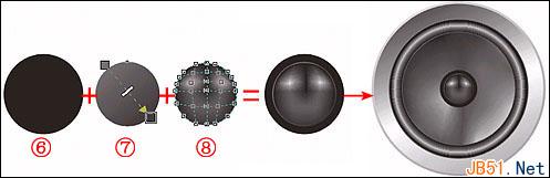 ④、第四个,模拟喇叭音盘的圆形,我们用了“网状填色工具”,在中央偏左下和右下侧边缘的两部分填上很浅的灰色;