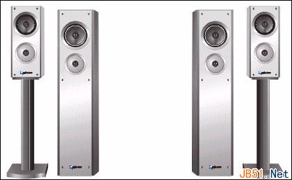 ②把右侧大小两个音箱的正面整体(包括正面面板、喇叭和“商标”)均又再一次水平翻转回原状态,这样左右两侧的音箱,从光影角度来看就统一多了