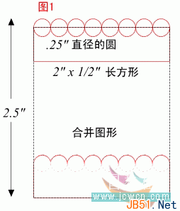 选取圆形和小长方形,在“排列”下拉菜单中选择“合并对象”功能,该过程将清除圆形的下边及长方形的上边,构成一个完整的图形,复制该图并将其置于原图之下2.5”处。效果见(图1)。
