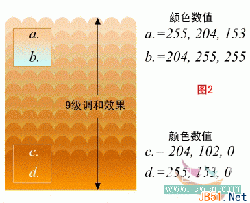 使用填充工具的线性填色方式为上部的合并图形着色,选用颜色数值为a和b。接下来,使用图中的c,d两色为下面的图形应用线性渐变色。选取工具条中的“调和”工具,然后点选下面的波浪状图形,并向上图拖动鼠标,使之产生渐变的调和效果。在属性栏中将调和层级设为9,效果见(图2)。