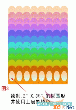 使用椭圆工具绘制一个.20”X.35”的椭圆,并将上层图形的颜色复制到新绘制的椭圆中。将该图复制7遍,并如图中所示排列,如果不齐可使用“对齐”工具中的均匀分布功能加以调整。群组所有图形。效果见图(3)(小技巧提示:各位在复制图形属性时,比如颜色等,我们可以通过右键点击图形并拖放到目标图形的方式解决)。