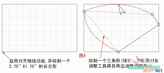 启动“对齐格线”功能,绘制一个2.75”X1.75”的长方形,图中的粉色虚线格子代表辅助格线的宽度为1/4”。使用自由笔工具绘制一个三角形,图中标为绿色虚线。取消对齐格线,使用对象编辑工具,按图中所示的方式调整该三角形,图中标为红色。调整后的结果是该图形上边和左边分别成弧形,正个图形象一个蝴蝶翅膀,效果见图(4)。