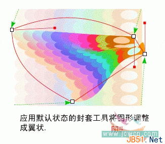 这工作比较复杂,让我们干吧!首先,选取调和并群组后的对象,逆时针旋转90度并按图中所示的样式将其置于上一步画好的翼状图形中心。在主工具栏中选取造型工具的“封套”功能,在默认状态下,使用鼠标分别拖动封套的四个顶角,即(图5)中绿色箭头所指的地方,使图形各边扭曲变形,并移动到示意图所示的位置。该过程试图将我们做好的调和图与后画的翼状图重合,从而制作出一个蝴蝶翅膀的雏形,效果见(图5)。