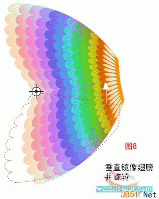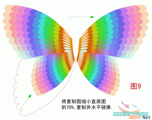 接下来,将复制图缩小为原尺寸的70%,并如图所示位置安置。圈选上下两翼,复制,并为复制图做水平镜像处理。好了,现在我们的蝴蝶羽翼丰满就差身躯了。效果见(图8)和(图9)