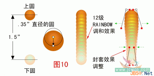 绘制一上一下两个直径均为.35”的圆形,并分别填入图2中使用过的颜色。其中上面的圆使用C,D两色的圆形渐变色,填色中心点如图中所示。为下面的圆形填入A,B两色的圆形渐变色,中心的调整如上图。选择两个圆形并为之应用12级的RAINBOW调和效果,接下来,使用“造型工具”中默认方式的“封套” 效果进一步调整蝴蝶的身躯直至图中的效果。效果见(图10)。