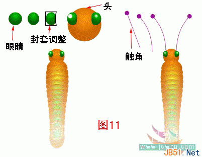 在这节里我们介绍如何制作蝴蝶的头,眼及触角。首先,绘制一个圆形作为头,并为之填入与躯体上部相同的颜色。将头通过SHIFT+PAGEDOWN的快捷方式置于躯体之下,并稍微向下移动一点。再绘制一个小圆,并使用深绿(RGB 0, 102, 0)和中绿(RGB 102, 255, 102)为其进行圆形渐变着色。接下来,选取该圆并为之应用默认设置的封套效果,将其调整成图中的效果。为使眼睛更为有神,我们再使用圆形工具绘制一个白色小圆作为眼部的高光点。复制群组后的眼睛,做水平镜像,然后将两个眼睛分别置于头部两侧。使用贝塞尔线条工具绘制一条紫色的线条,然后通过节点调整工具将其按图中的样式调整为曲线。接下来,我们再画一个紫色的小圆作为其触角的头。群组两图,复制并做水平镜像,然后分别置于头的上部两侧,效果如(图11)。