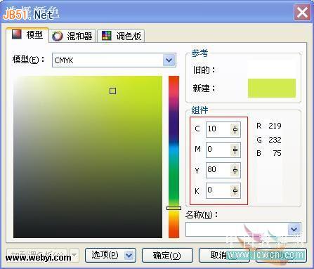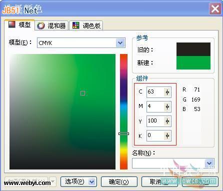 5、用同样的方法为“颜色调和”选项区“到”后的色块设置颜色为淡绿色(C:10,Y:80),最后将“中心位移”选项区的“垂直”参数设置为17%,如图5A所示: