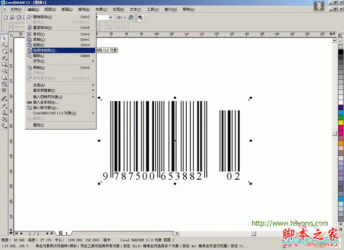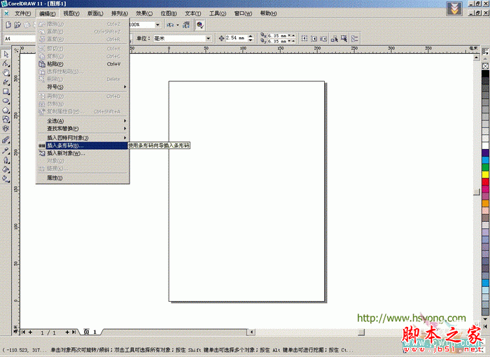 2.以CorelDRAW11中文版(6\7\8\9\10\11\12各个版本此功能均可通用)为例,点选菜单——编辑——插入条形码,如图:
