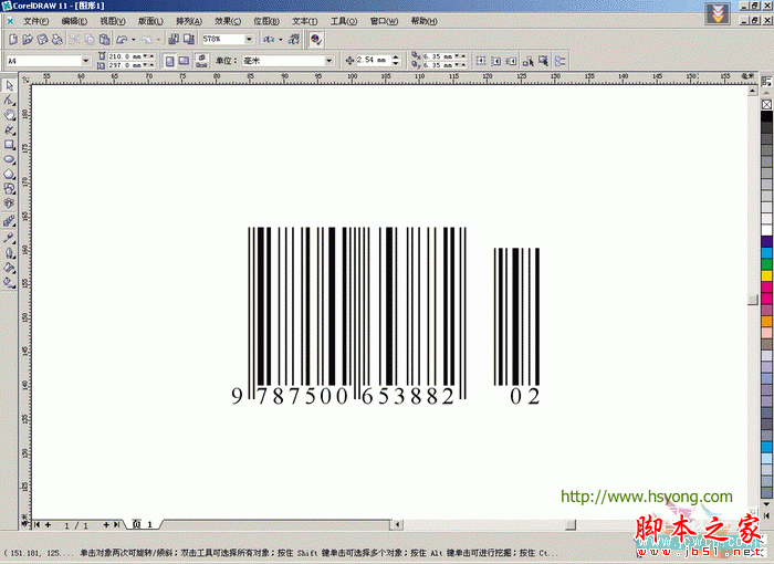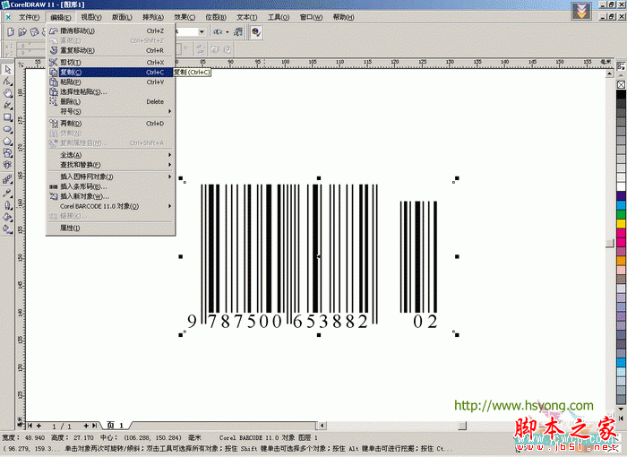 7.条形码出现在工作面板中,暂时不作任何修改。点选菜单——编辑——复制(或直接按Ctrl+C),复制条形码。