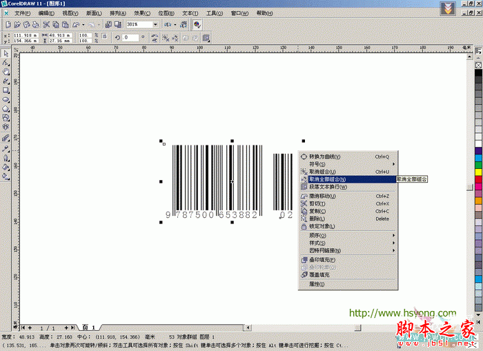 10.现在开始编辑粘贴后条形码,取消全部组合: