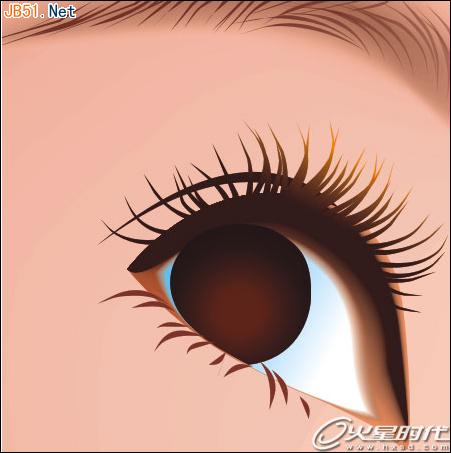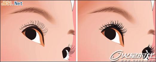 (6)用绘制眉毛的方法处理眼睫毛。因为这里使用的笔触两端形状不一样,所以要注意一个问题:绘制曲线时每条线都应要以靠近眼的那一方为起始点,所有曲线的起始与终止点要保持统一。