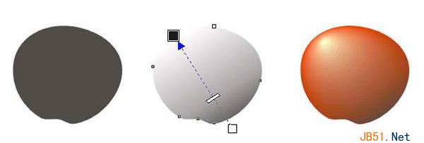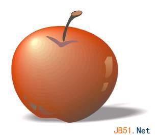 3)下面制作的是苹果表面的阴影效果。选中苹果的红色轮廓图形并按数字键盘上的+键将它复制,然后将复制的图形移动到一边;现在将复制图形重新填充为黑色,选用互动式透明度工具点中黑色图形右下方的一点并向左上方拖动,到达图形边缘时松开,这是一个黑色的半透明图形;将半透明图形放置在渐变图形组的上面,你得到了期望的阴暗效果,如图:
