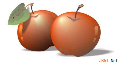 (7)选中叶子的所有组成部分进行群组,将群组对象放置在第二个苹果的叶柄上,选用互动式下落式阴影工具从叶子的右端向下方拉出一个阴影。这个阴影落在了苹果上,画面显得非常生动有趣,如图:
