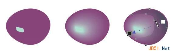 (8)制作一串葡萄,与前面制作的苹果稍有不同,你要表现出它的晶莹剔透的颜色来。你最好先在纸上画出它的大概结构和形状(最起码也要在大脑中构思一下),这样你在将这些葡萄颗粒组成一串葡萄时会觉得非常简单,否则最后的排列组合工作会搞的你头昏眼花!现在先来制作一个葡萄颗粒,还是先用一个椭圆形进行变形的方法制出它的轮廓,填充为深紫色(Deep River),然后在它上面画出受光的部位,因为它和苹果不同,它本身是略有透明的,所以反射出的光应该有它内部体液的颜色,这里我将它填充为青色(ghost Green);现在取消这两个图形的轮廓颜色,对它们进行20层的渐变操作;复制渐变组中的紫色图形,重新填充为一种深的蓝色(Deep Navy Blue),用造形工具将左面的节点向右推,把它加工成一个月牙状的图形;最后用互动式透明度工具给它加上透明度效果,效果不错!这个葡萄看起来真的是熟透了,如图: