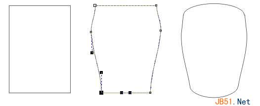 继续用造形工具改变它的形状。将最下面的两个节点分别沿水平方向向内移动相同的距离(使用键盘上的方向键将得到精确的移动),在图形的两腰上各添加一个节点,然后将这两个节点分别向外移动……我们制出了一个鼓肚的图形,然后用造形工具选中顶边中间一点并向上移动形成一个突起,最后将底边也做相应的改动,形成一个花瓶状轮廓图形,你需要对它进行再修改,以求更好的效果,制作过程如图: