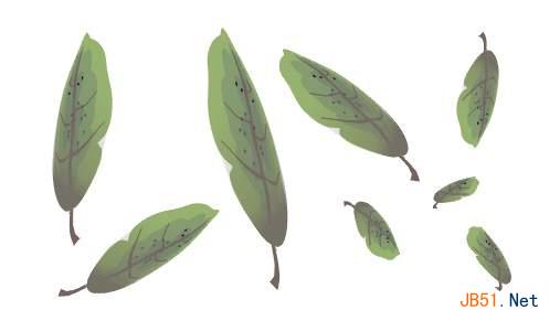 (13)下面制作花的叶子,它的制作方法和前面制作的苹果叶子基本相同,只是它的叶子更大一些,在形状上有所不同,这个任务就交给你来做了。最后将这个叶子进行复制,并对复制对象进行缩放、拉伸、旋转、镜像等操作,你将得到一组大小不等、形态各异的叶子,如图