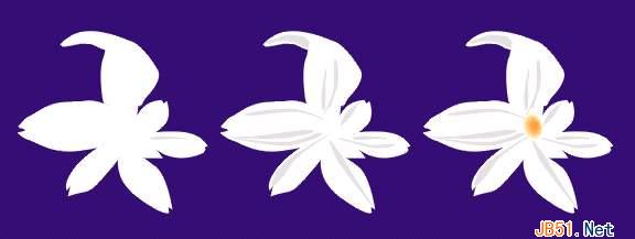 (15)该花朵图形填充为白色(为了便于观察,以下有关的效果图例均置于深色背景之上),用贝兹曲线工具在它上面画出一些花瓣的细长纹理,填充为浅灰色(10% Black),最后取消它们的轮廓颜色,这样看起来更自然一些;将一个橘黄色(Light Orange)的小圆与一个稍大一点儿的浅黄色圆(Pale Yellow)放置在一起进行30层的渐变操作,取消渐变组的轮廓颜色,这是一个花蕊图形。最后将它放置在花朵图形的中心,选中花朵的轮廓图形、纹理和花蕊进行群组,这个花朵就做好了,如图