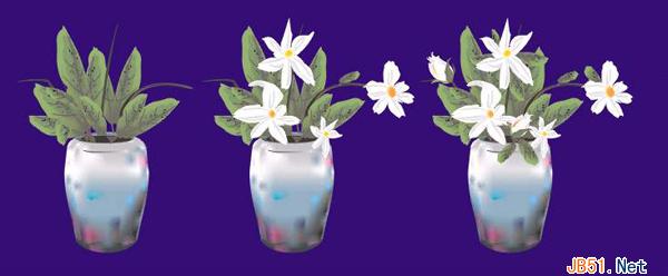 将叶子放置在花瓶上面,你需要精心地组合一下,是表现你艺术家的独特气质的时候了!放好叶子后,用贝兹曲线工具在叶子中间画上一些花的茎,再将制好的花朵放在叶子上;在花朵的后面添加一些小的叶子,然后制出两个含苞待放的花骨朵,也放置在画面中;你还要调整它们的排列顺序,直至你满意,最后将它们进行群组,如图