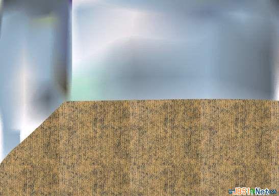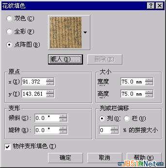 (17)我所构思的这个背景是简单和不很清楚的,为的是更充分地表现画面的主体部分。用两个矩形和一个不规则的多边形表示墙面和展台,然后用互动式网状填色工具对墙面进行填充,注意在两个墙面相交的地方产生一条明显的色彩分界线;选中作展台的多边形,打开“花纹填色”对话框,然后勾选其下的“点阵图”选项,载入一张布纹的材质(在本书配套光盘的“材质”目录下,你可以找到它,文件名是Sb010.bmp);将“大小”栏下的“宽度”和“高度”的值都设置为75.0 mm,再勾选对话框左下角的“物体变形填色”;最后单击“确定”进行填充,对话框设置及填充效果如图