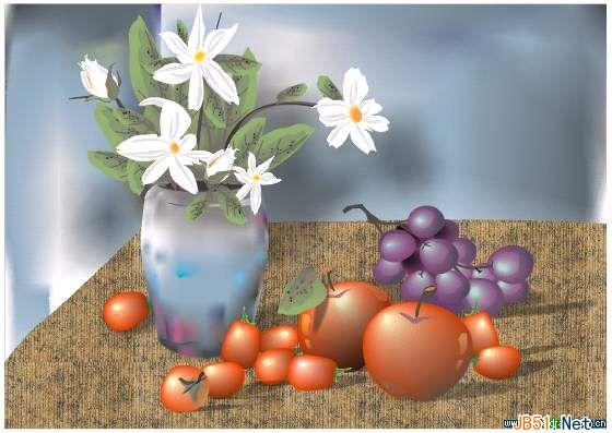 (18)现在将花瓶对象放置在背景中(中间偏左的位置上),选中群组后的花瓶,将它解散群组,然后选中花和叶部分进行群组,现在这个花瓶被分为花和瓶两个部分。用互动式下落式阴影工具选中花叶部分的中心,向右下方拖出一个模糊的打在背景墙上的影子;再用该工具选中瓶子部分的底部,向右上方拖出一个打在展台上的影子——这样,我们给一个物体加上了两个不同方向的不同类型的阴影。再把水果等对象都放在画面中,调整所有物体之间的大小、排列、布局之间的关系,最后的标准还是达到你的满意,效果如图