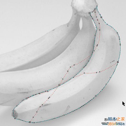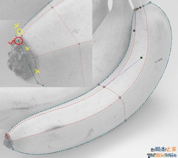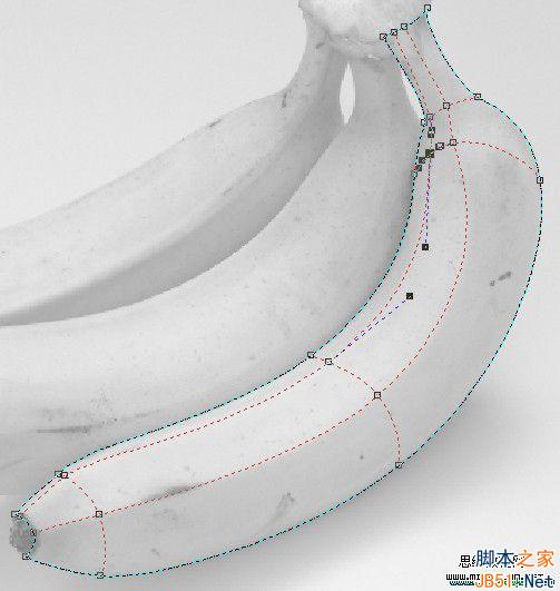 7、放大显示,在底端边线合适的位置双击生成第二主线,也把它调整到与香蕉的第二突起棱线重合。请
