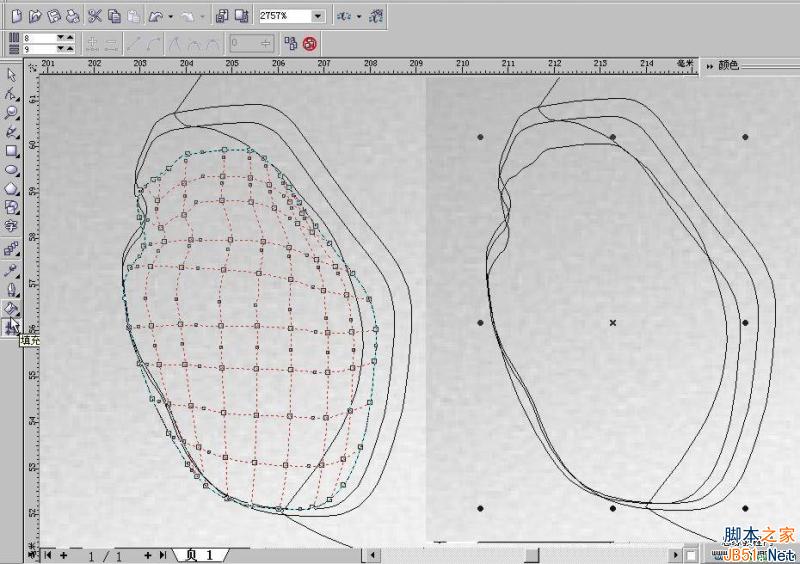 删除多余节点的另一个目的是要找到网格的“关键节点”(“关键节点”只是我的叫法,不知Corel公司是否承认),我发现任何闭合图形对象只要用于网格填充,都会有4个“关键点”,它们控制着网格的走向和分布。 为了说明问题,我做了一个对照图。