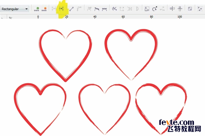 比如说您希望"艺术媒体"笔刷的笔划方向不同。这里就有一个您可以使用的小窍门。首先,选择完美形状,转换为曲线 (Ctrl+Q),然后使用形状工具 (F10) 选择希望成为笔刷的"起点"和"终点"的新点。例如,尝试红心的底部节点。然后在属性栏上单击打散。您还可以在对象的任何点上添加节点,然后打散节点并应用"艺术媒体"笔刷。通过选择不同的"起"点,"艺术媒体"笔刷将制作出不同的效果。